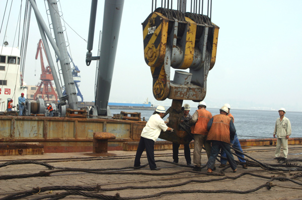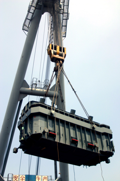 由于門機(jī)不能起吊這樣的大型設(shè)備,所以有關(guān)部門聯(lián)系到海吊,進(jìn)行裝船作業(yè)。不要以為海吊來(lái)了就萬(wàn)事大吉了,往這個(gè)負(fù)荷200T的大鉤頭上掛鋼絲繩就十分麻煩?! ?/p>