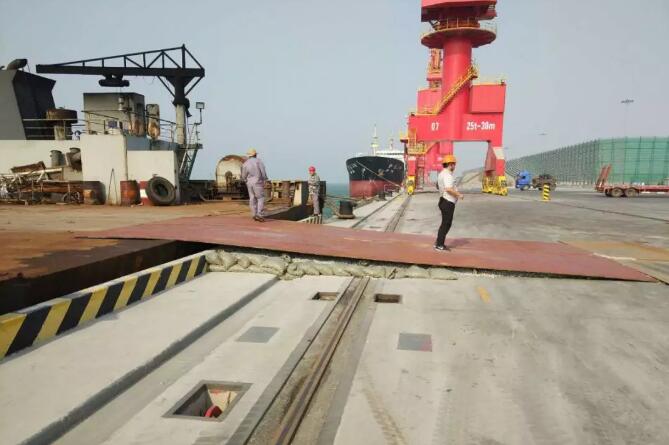 為做好首次大件設(shè)備接卸工作,集團(tuán)公司高度重視,認(rèn)真謀劃,先后召開3次裝卸流程技術(shù)調(diào)度會。結(jié)合碼頭承臺結(jié)構(gòu),積極制定船舶靠泊、護(hù)輪坎及軌道防護(hù)方案,準(zhǔn)確核算碼頭前沿承載負(fù)荷,并根據(jù)潮汐情況確定最佳的卸船時間,保證了貨物的安全接卸。