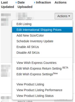 若要為促銷產(chǎn)品手動(dòng)編輯“國際運(yùn)費(fèi)”,請(qǐng)?jiān)诋a(chǎn)品頁面點(diǎn)擊“措施> 編輯國際運(yùn)費(fèi)”。
