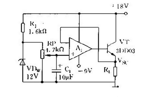 圖1-34所示,由穩(wěn)壓管VDw供給的12V基準(zhǔn)電壓通過(guò)電位器RP加到運(yùn)放A1的同相輸入端,穩(wěn)壓電源的輸出電壓Vsc又反應(yīng)到A1的反相輸入端,當(dāng)Vsc發(fā)生變化時(shí),它與同相輸入端電壓的差值被運(yùn)放放大,以操控調(diào)整晶體管VT的基極電流,改動(dòng)發(fā)射極與集電極間電壓降,從而使輸出電壓保持安穩(wěn)。此電路雖然簡(jiǎn)略,但客服了取樣電阻分壓比對(duì)安穩(wěn)性的影響,在不同的Vsc時(shí)有相同的反應(yīng)深度,且放大器的閉環(huán)增益為1,反應(yīng)最深,Vsc的安穩(wěn)性好。又由于Vsc就等于同相輸入端電壓,調(diào)理電位器RP就能夠使Vsc在0~12V范圍內(nèi)恣意改動(dòng)。
