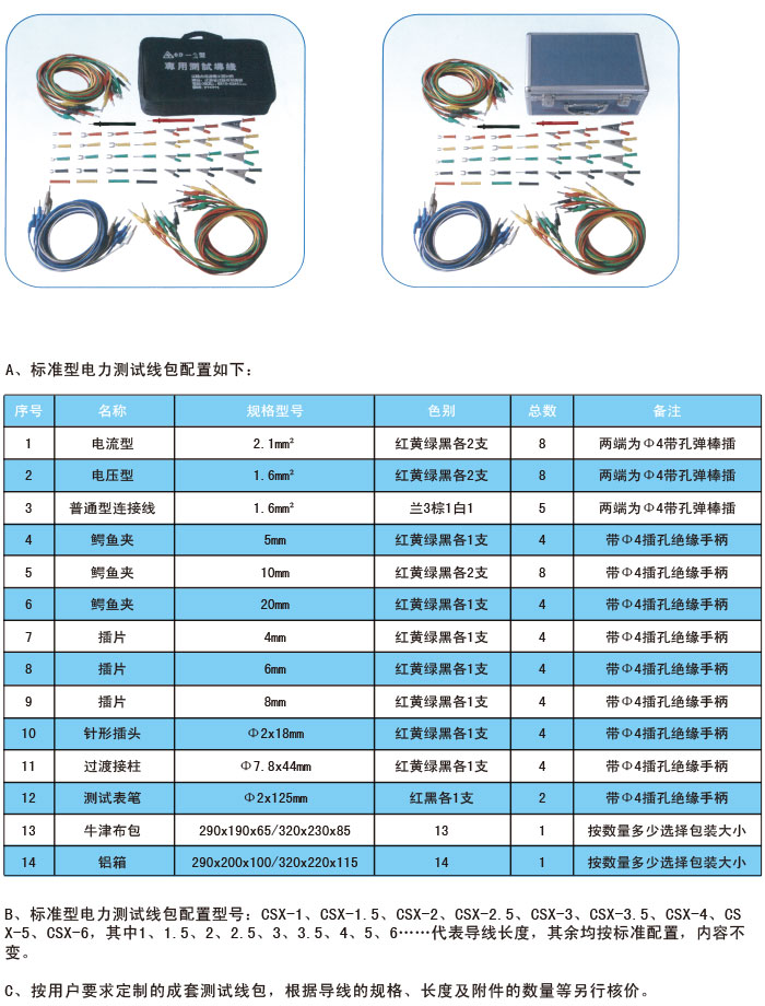 CSX系列電力試驗專用測試導(dǎo)線包有標(biāo)準(zhǔn)型配制和按用戶要求配置兩種形式。包裝分牛津布包裝和鋁合金箱包裝兩種形式。具體均可按客戶要求定制。型號以線長而定,即1型為1m,2型為2m,… … 以此類推。上海征原為您提供各種技術(shù)規(guī)格電力專用測試導(dǎo)線、歡迎來電咨詢。